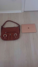 Dual front flap pockets with bold ring hardware for a luxe statement